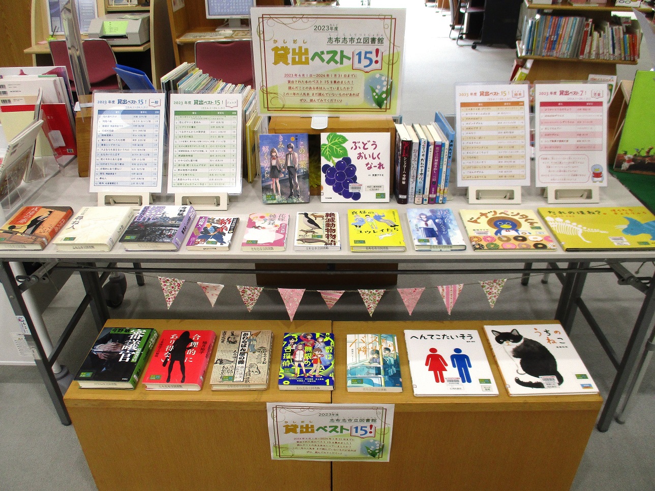 特設展示「2023年度 貸出ベスト15」(2024.4.17終了) 公開済み: 2024年3月1日更新: 2024年4月23日作成者: 志布志市立図書館カテゴリー: 特設展示 志布志市立図書館 ホールにて、2023年4月1日~2024年1月31日までに貸出された本のベスト15を集めました。 一般・ジュニア・絵本・児童の4部門で貸出が多かった図書をランキング形式で紹介しています。 好きな本、読んだことのある本は入っていましたか? まだ読まれていない本がありましたら、ぜひ読んでみてください。 ホール展示「2023年度 貸出ベスト15」