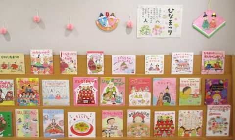 ひな人形やちらし寿司、さくらもちなど、ひなまつりの絵本やおはなしをあつめています。