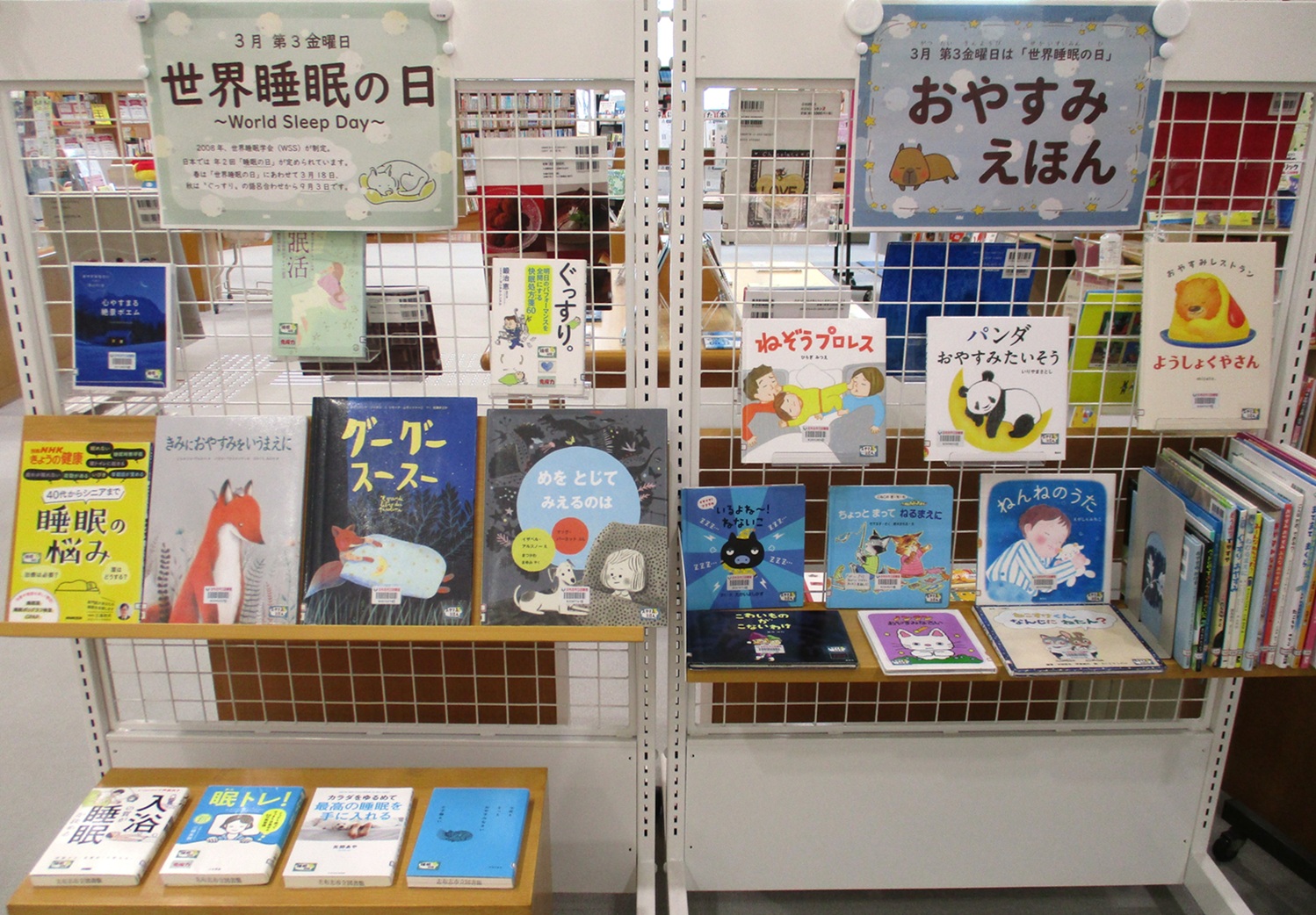 図書館では、夜が舞台のふしぎな絵本や寝る前に読みたいおやすみ絵本、快眠するための本などいろいろ展示しました。